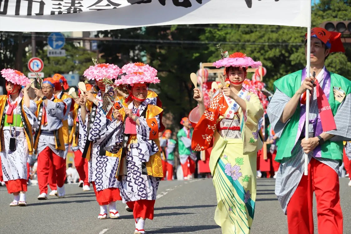 毎年5月3・4日に開催される、観客200万人超という日本有数の祭り。伝統的な民俗行事「博多松囃子」が起源で、福岡市内中心部で行われる大規模なパレードや、市内約30カ所に設置されたステージでの演舞など見どころが盛りだくさん。街全体が華やかなムードに包まれます!