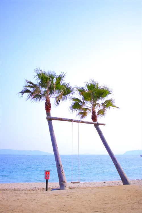 海岸沿いのレストラン「ハーバーハウスBBQガーデン」の敷地内にある、ヤシの木を利用したブランコ。写真映え抜群!