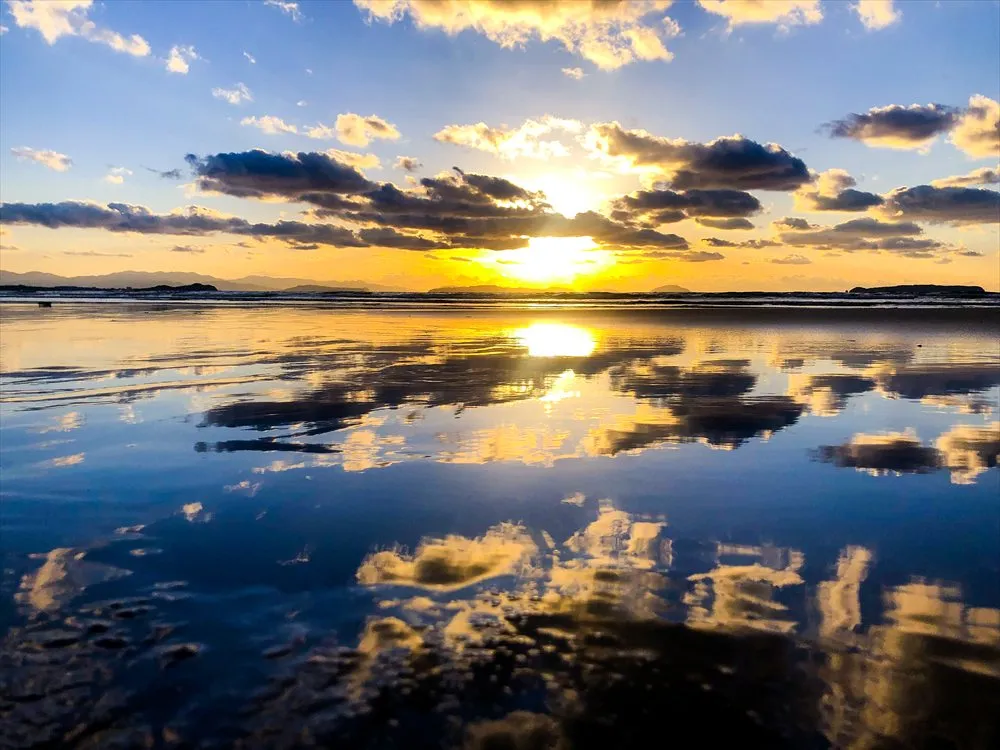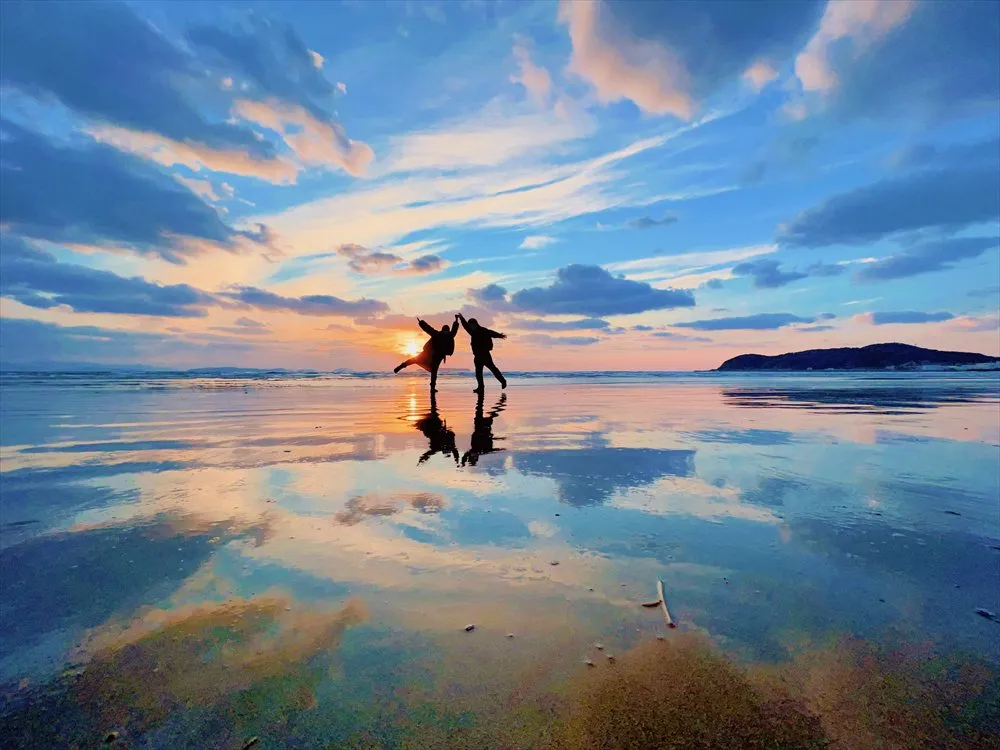 宮地嶽神社から海岸に向かって15分ほど歩くと、南北3kmにわたる遠浅の砂浜が広がっています。ここでは大潮~中潮の干潮時に砂浜が鏡のように空を反射する絶景が出現。幻想的な写真を撮ってみよう!