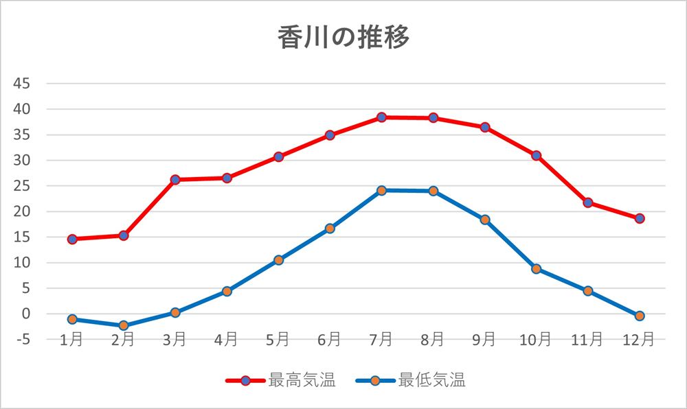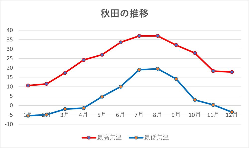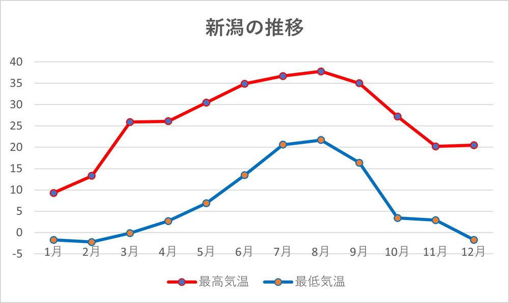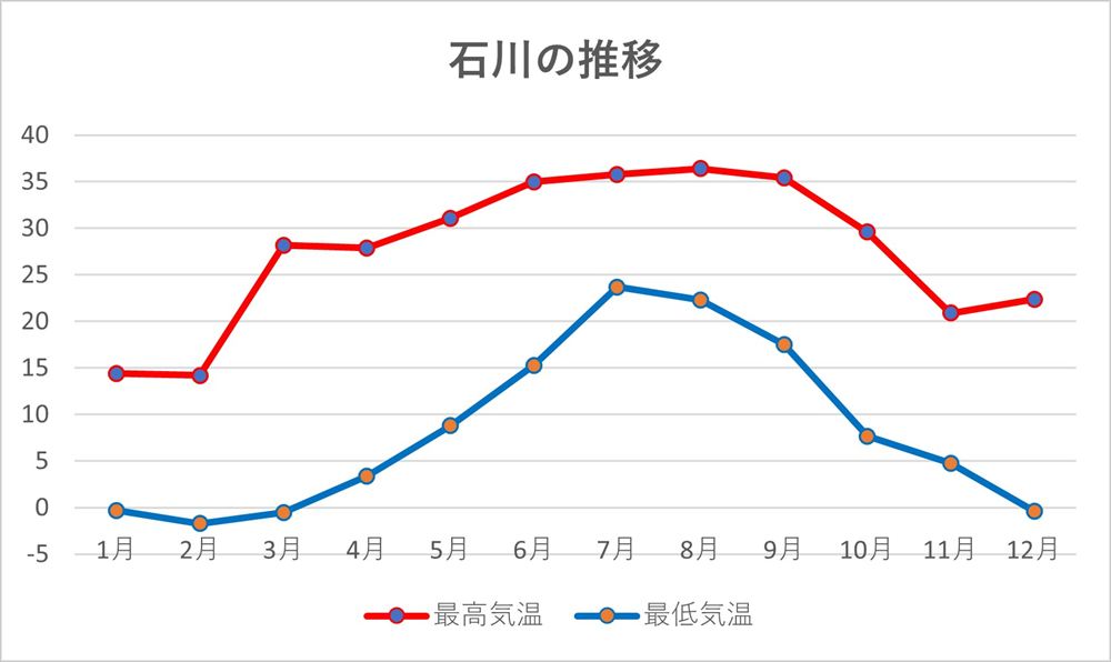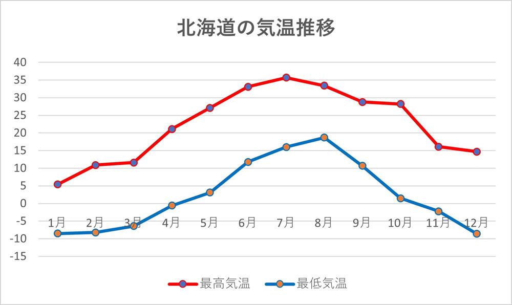 夏は晴れた日が多いため、気温も高めです。一方、冬は雪や雨が多く、気温も低いです。
