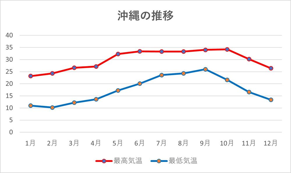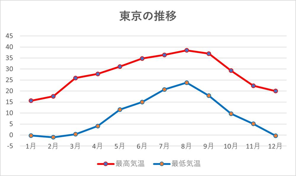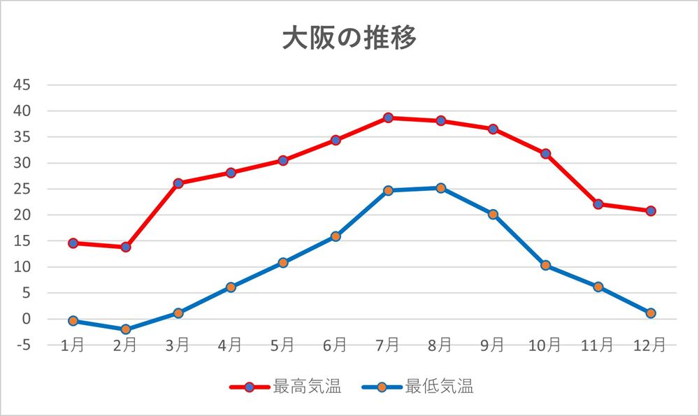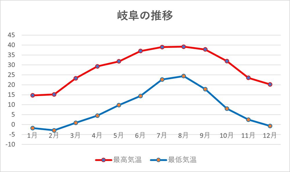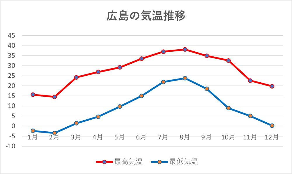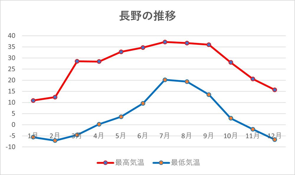 夏は晴れた日が多いため、気温も高めです。一方、冬は雪や雨が多く、気温も低いです。