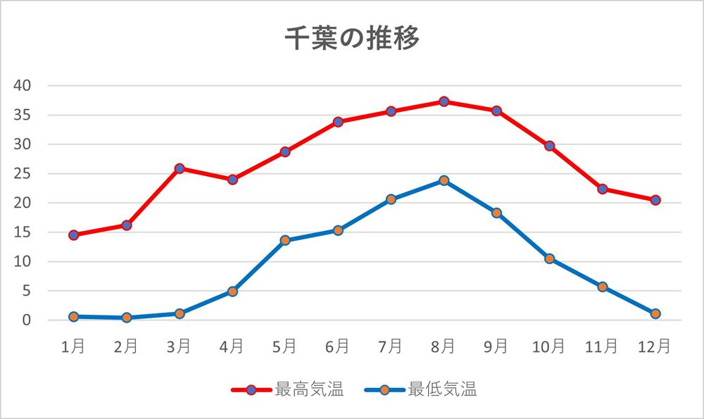 梅雨や台風の影響を受けやすいので、その時期は雨が多くなります。その影響もあり、夏は蒸し暑い気候となることが多いです。一方、冬は晴れて乾燥した日が多いです。