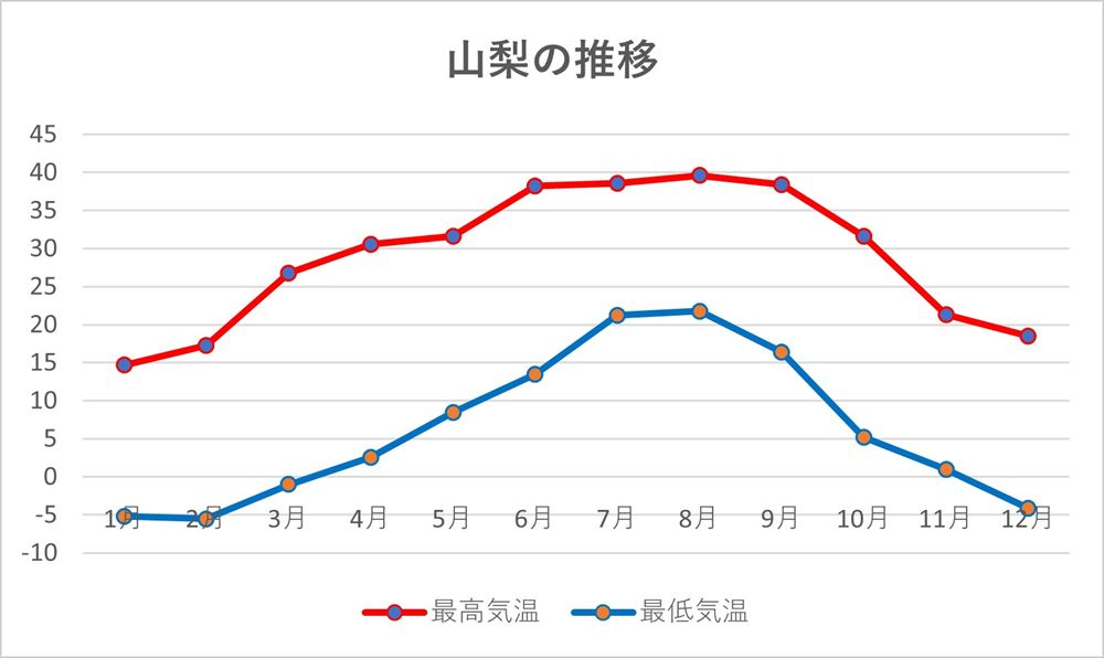 海から離れているため、夏と冬の気温差、昼と夜の気温差が大きいです。また1年を通して雨は比較的少ないです。