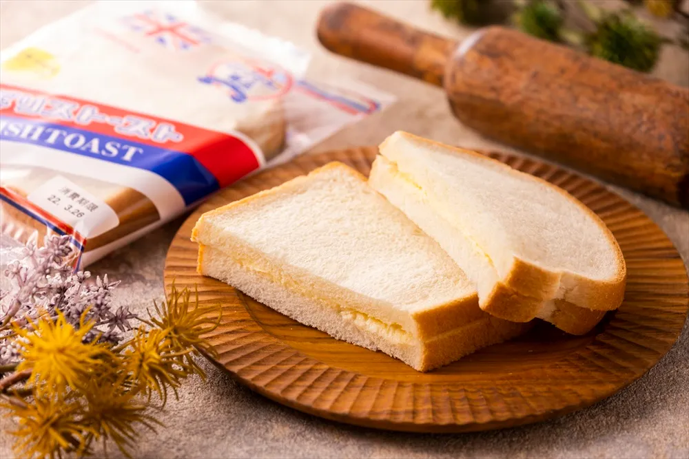 マーガリンを塗った食パンにジャリジャリ食感のグラニュー糖をかけてサンドした菓子パン。創業地の青森県むつ市大湊地区で、バタートーストに砂糖をかけて食べる習慣があり、それを参考に作られました。イギリスパンと呼ばれる山型の食パンを使用していることが名前の由来。