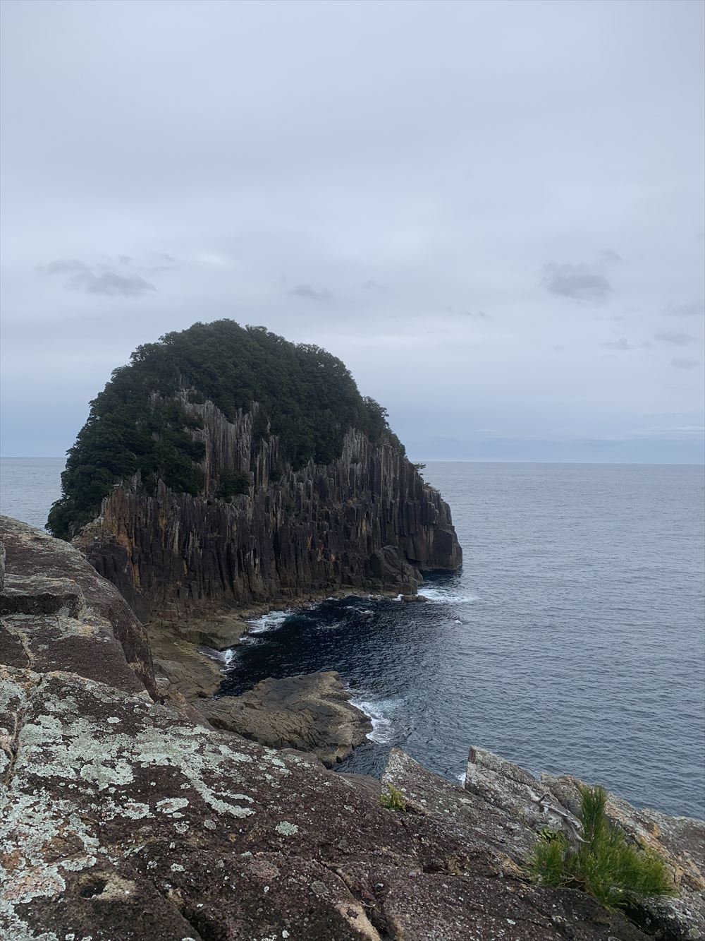 高さ約80メートル、周囲約55メートルの巨大な岩塊だ。崖の縁に立つと、足元から熊野灘の海が大きく広がる。熊野灘に楯を並べたように見えることから、楯ヶ崎と呼ばれるようになった。