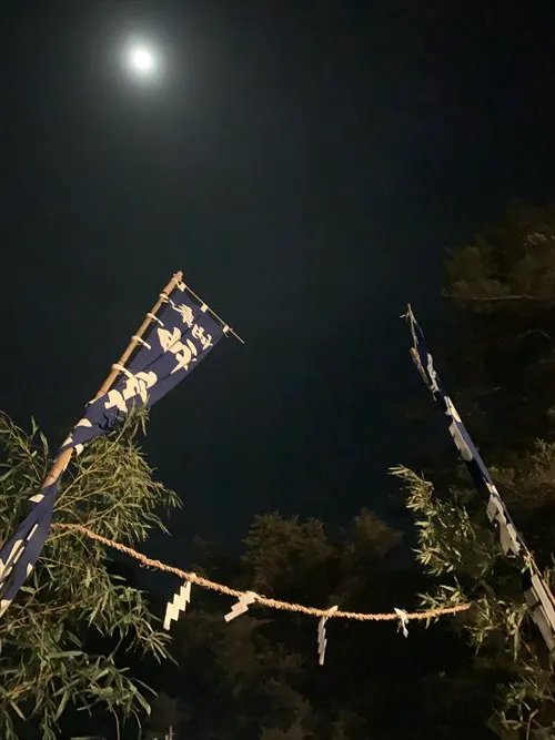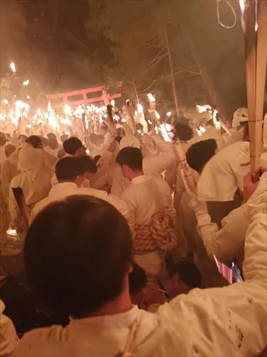 夜、山の上で御神火が起こされ、やがて門が開く。