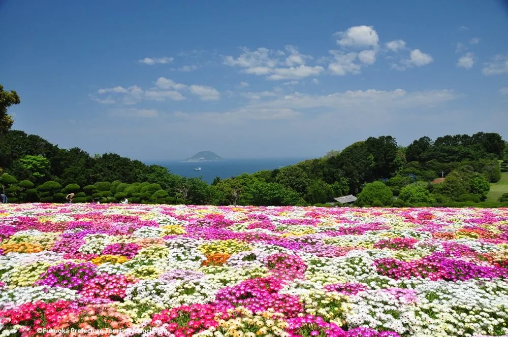 漂浮在博多灣上的「能古島」,是一座周長12公里、自然資源豐富的島嶼。前往位於島嶼北側的自然公園「能古島海島公園」,以大海為背景,全年可以欣賞到約30種四季花卉。4月上旬至5月中旬期間,色彩鮮豔的彩虹菊如馬賽克畫般延展開來,景色非常壯觀!從福岡市內的港口搭渡輪約10分鐘就能抵達,是個遠離日常的療癒景點。
