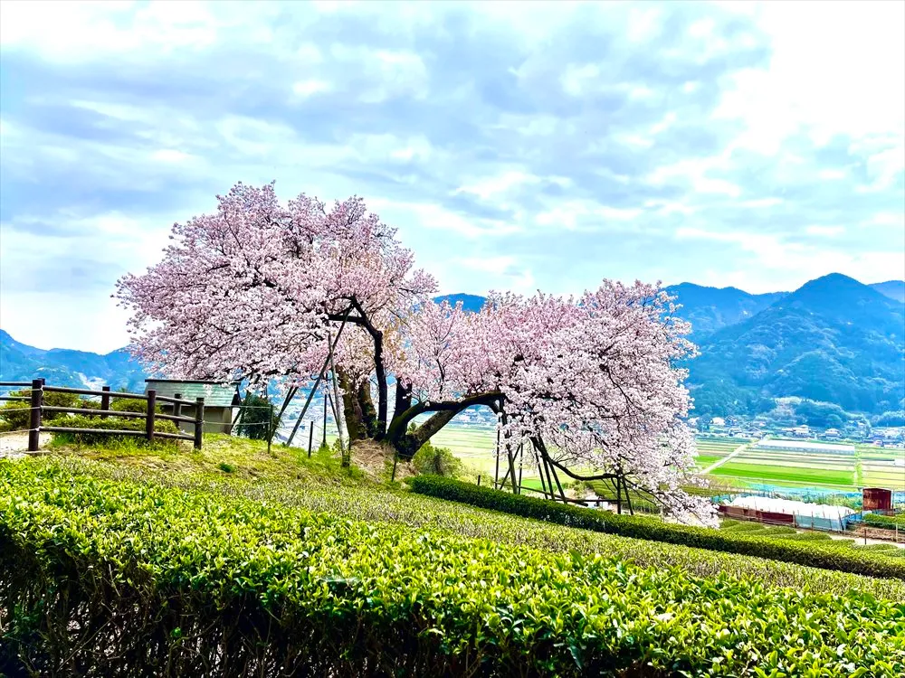 環繞溫泉街的豐富自然景觀,也是嬉野的一大魅力。若在櫻花盛開的季節(3月中旬~下旬)造訪,推薦前往「納戶料的百年櫻」。樹齡超過百年的單棵櫻花樹佇立於茶園之中,景色十分壯觀。